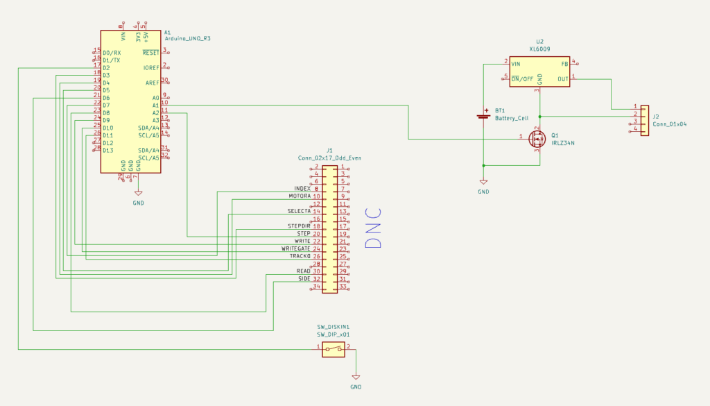 One crucial finding was that the ground side of the interface cable should absolutely not be connected to any grounds on the microcontroller side. I was using a relatively simple logic-level MOSFET, the IRLZ34N, to turn off the drive by disconnecting the ground side. If any ground is connected, the disk won’t turn off. But also: if any logic pin was being pulled to ground by the ATmega, that would also provide a path to ground. But since the ATmega cannot sink that much current this would lead to spurious resets! Obvious after the fact, but this took quite some headscratching. Setting all the logic pins to input, and thus high impedance, finally fixed the stability issues.
